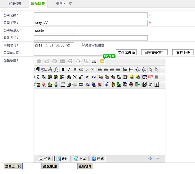 1.在“公司名称”字段,填写链接的公司名称。2.在“公司主页”字段,填写链接的公司网址。3.在“公司联系人”字段,填写链接的公司联系人信息。4.在“联系方式”字段,设置链接的公司联系方式。5.在“添加时间”字段,填写链接的添加时间。6.在“是否审核通过”字段,设置链接是否审核通过。7.在“公司LOGO图”字段,可以选择直接上传和文库选择,添加LOGO文件。8.在“链接备注”字段,填写链接备注信息。