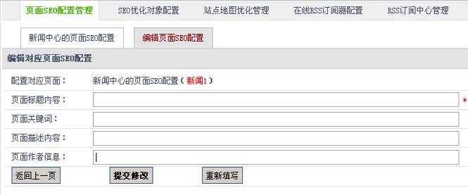 1.在“配置对应页面”字段,显示正配置的对应名称,2.在“页面标题内容”字段,填写在浏览器窗口标题显示的文字。3.在“页面关键词”字段,填写页面内容相关的关键词,以利于搜索引擎搜入。4.在“页面描述内容”字段,填写对页面描述文字内容。5.在“页面作者信息”字段,填写页面作者信息。
