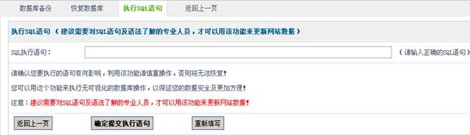执行SQL语句 (建议需要对SQL语句及语法了解的专业人员,才可以用该功能来更新网站数据)请确认您要执行的语句有何影响,利用该功能请慎重操作,否则将无法恢复!您可以用这个功能来执行无可视化的数据库操作,以保证您的数据安全及更加方便!注意:建议需要对SQL语句及语法了解的专业人员,才可以用该功能来更新网站数据!
