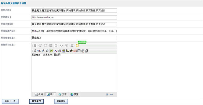 5.在“底部版权信息”字段,输入网站的名称,版权开发日期等。